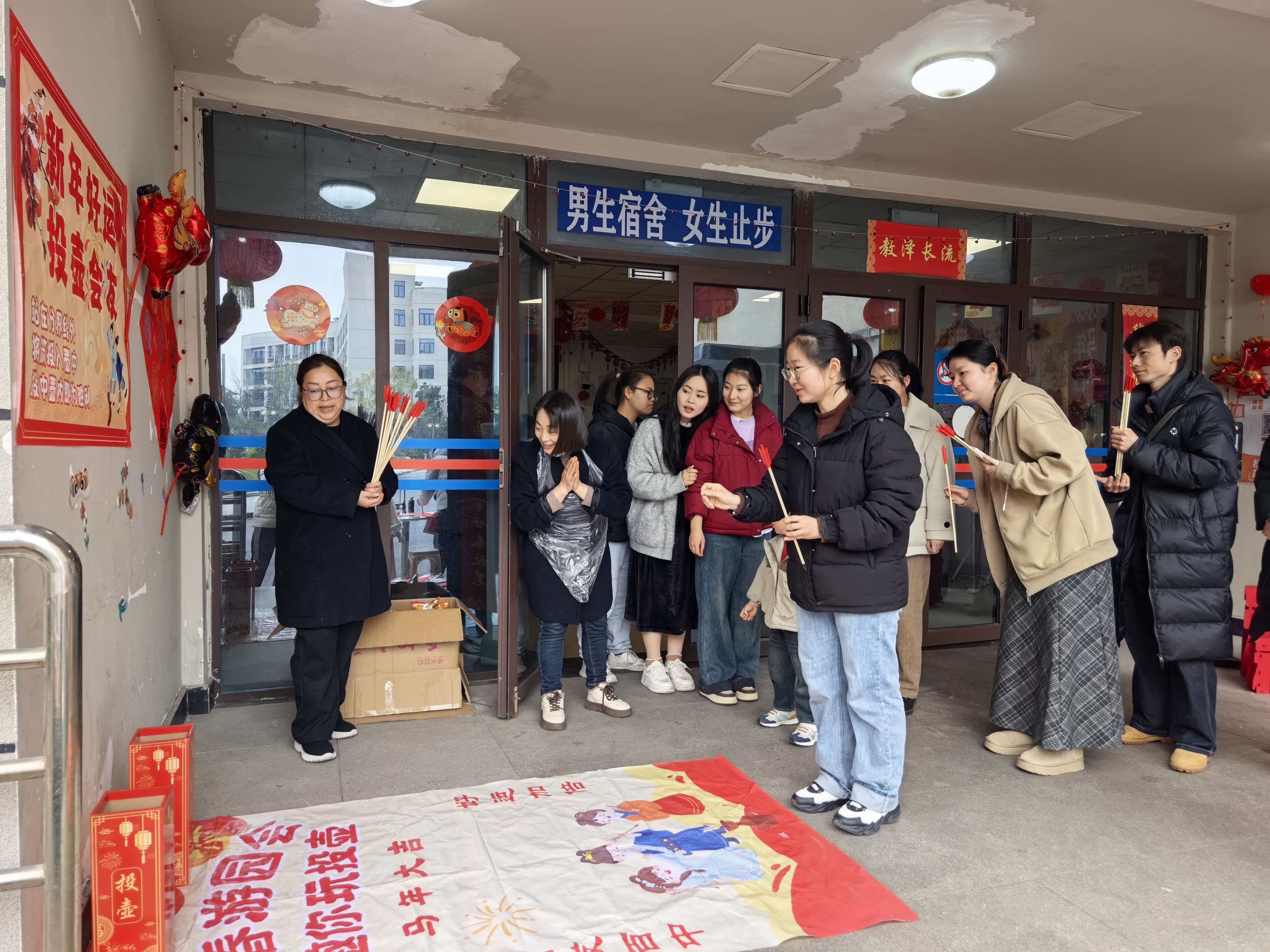 校领导来到学生宿舍看望慰问坚守岗位的员工时,正好撞见这片忙碌而温馨的景象。校长王进军详细询问了留校学生的数量和活动安排,对后勤的周到和员工的用心给予肯定:“有你们在,孩子们就能过个好年,家长们也就放心了。”