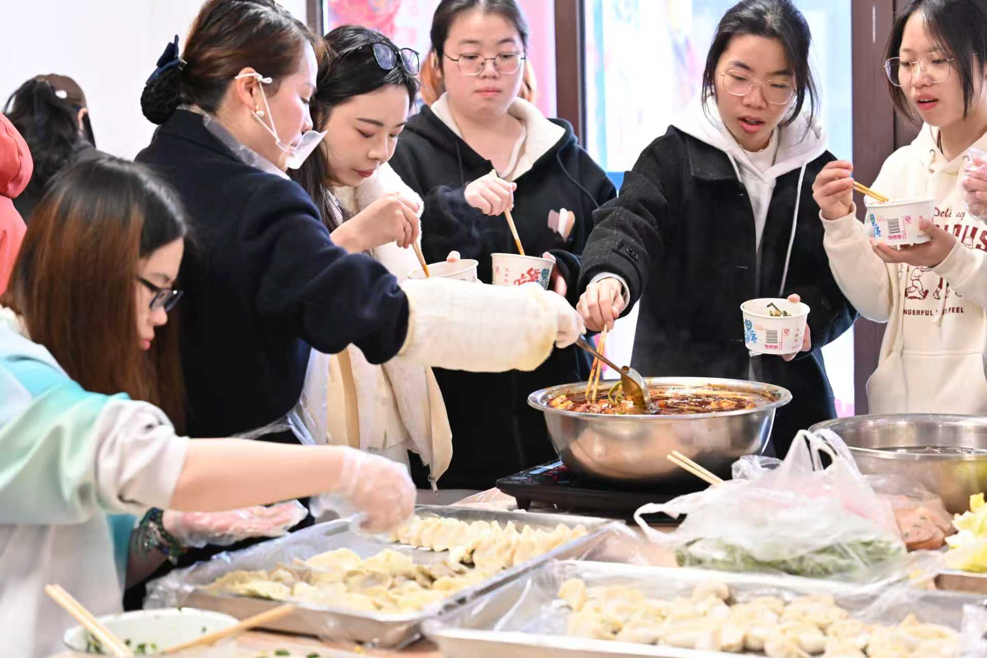 这是学生宿舍服务中心举办的“饺子里的团圆,窗花上的中国年——后勤有温度,留校不孤单”春节暖心活动的现场。一顿热热闹闹的团年饭,让600余名因科研、学业或路途遥远而无法返乡的学生,在学校找到了“家”的感觉。