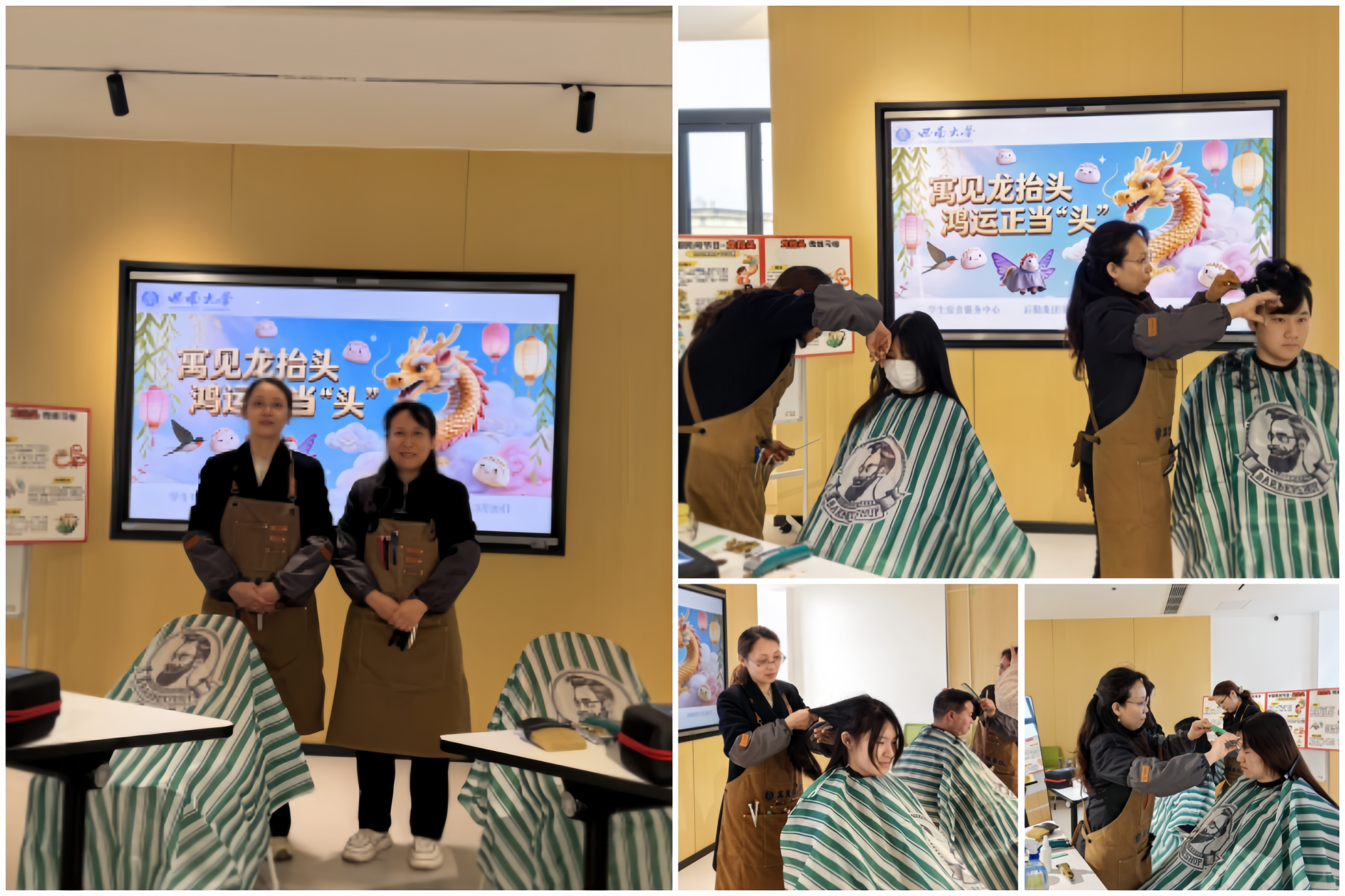 推剪声咔嚓作响,阿姨们手法利落,不时还和学生聊上几句。“帮我剪短一点,清爽就行!”“包的,肯定让你精神焕发!”一旁围观的同学有的举着手机记录,有的凑到展板前看“龙抬头”的习俗介绍,还有人一边等位一边发语音通知室友这“头”等大事。现场热热闹闹,却不嘈杂,传统节气的气息就这么不经意地扩散开来。