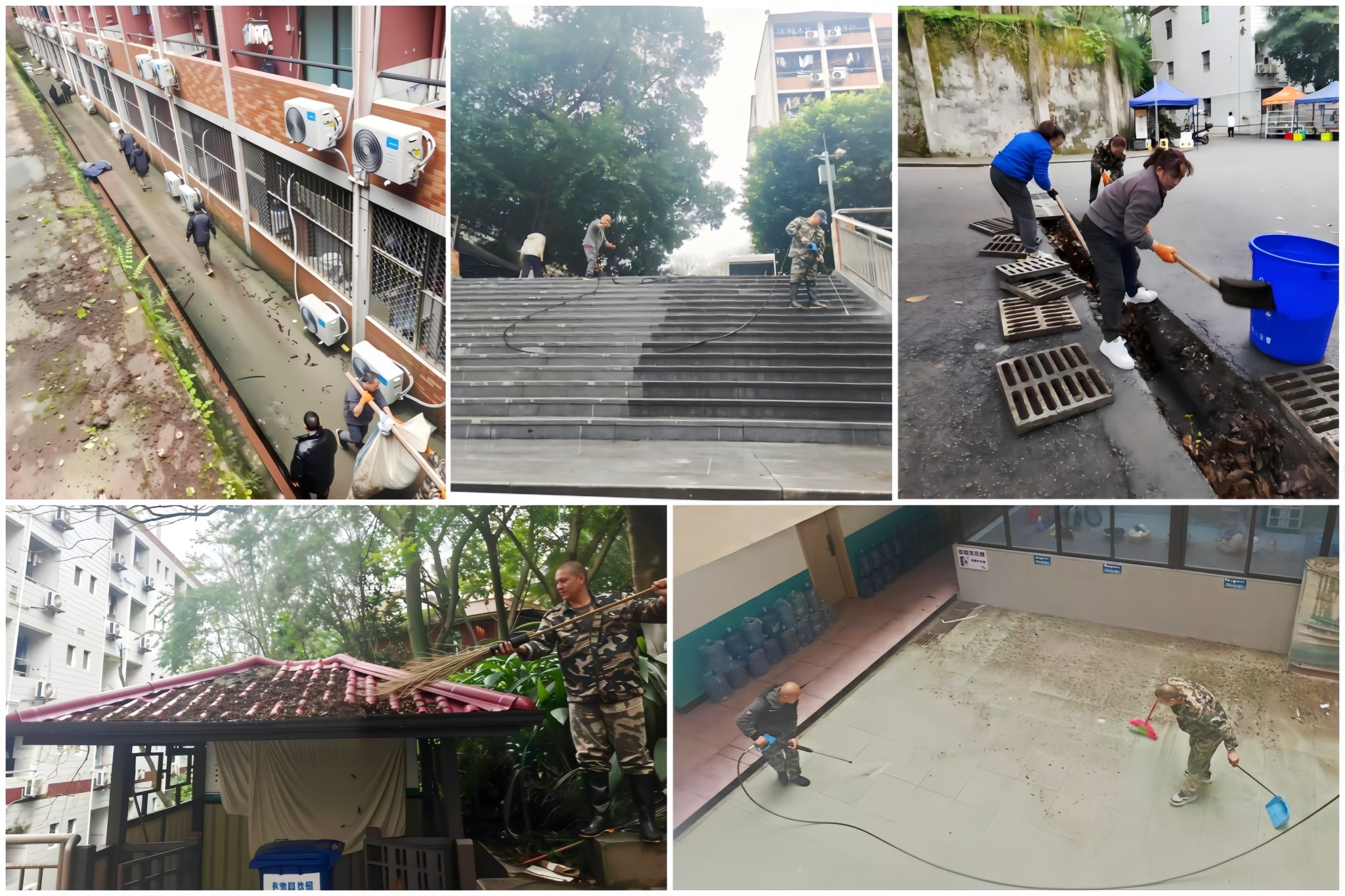此次行动重点解决卫生死角、排水沟淤积、绿化带白色垃圾和门头脏乱等问题,围绕”四个清理“展开:一是清理卫生死角,对园区周边、楼道夹层、绿化带边缘等长期易忽视的区域深度保洁,不留盲区;二是清掏水篦子,组织人员逐一掀开排水篦子,清理积存杂物,确保排水通畅、无异味;三是捡拾绿化带白色垃圾,深入绿篱、灌木丛等隐蔽部位,细致捡拾烟头、塑料袋等细小垃圾;四是清洁门头和顶棚,清理宿舍门头积尘、垃圾收集点顶棚落叶,清除过期宣传品,还原建筑立面整洁。