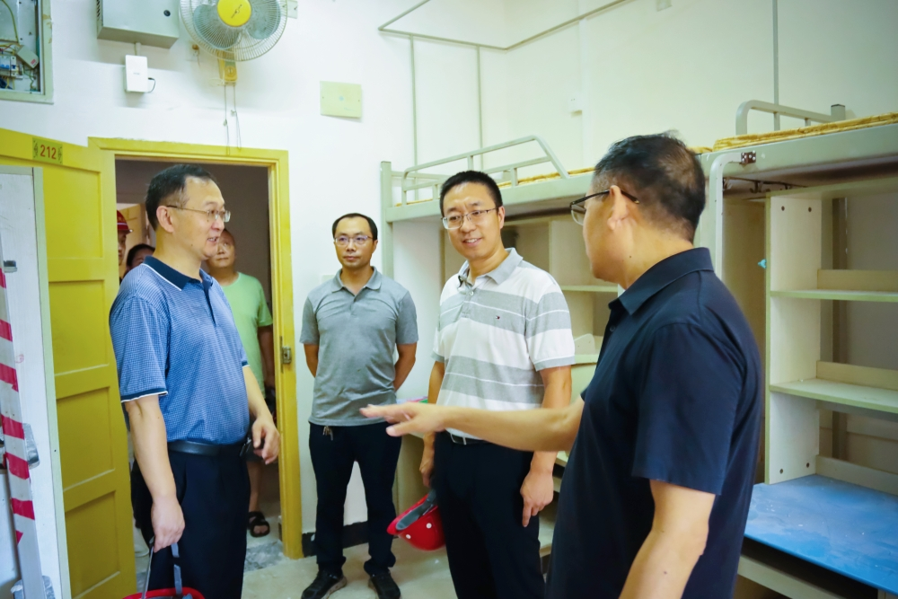 在学生宿舍,韩旭东查看了墙面粉刷、门窗维修、加装晾衣杆等工作的进展情况,重点检查了防高坠护栏、限位器等的安装情况,强调一定要高度重视学生的安全问题,在新学期开学前必须逐一检查、落实到位。