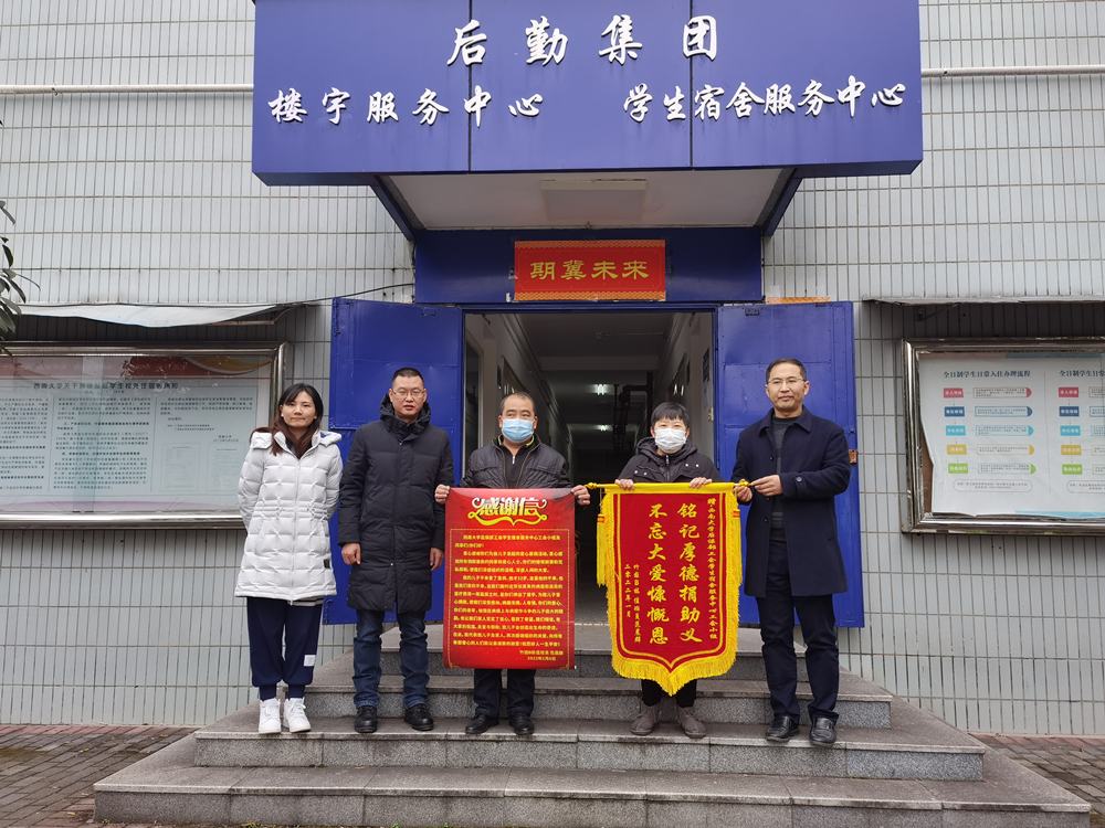 1月12日,竹园B栋值班员范晨琼与家人一道将一面锦旗和感谢信送到学生宿舍服务中心,表达对中心的感激之情。