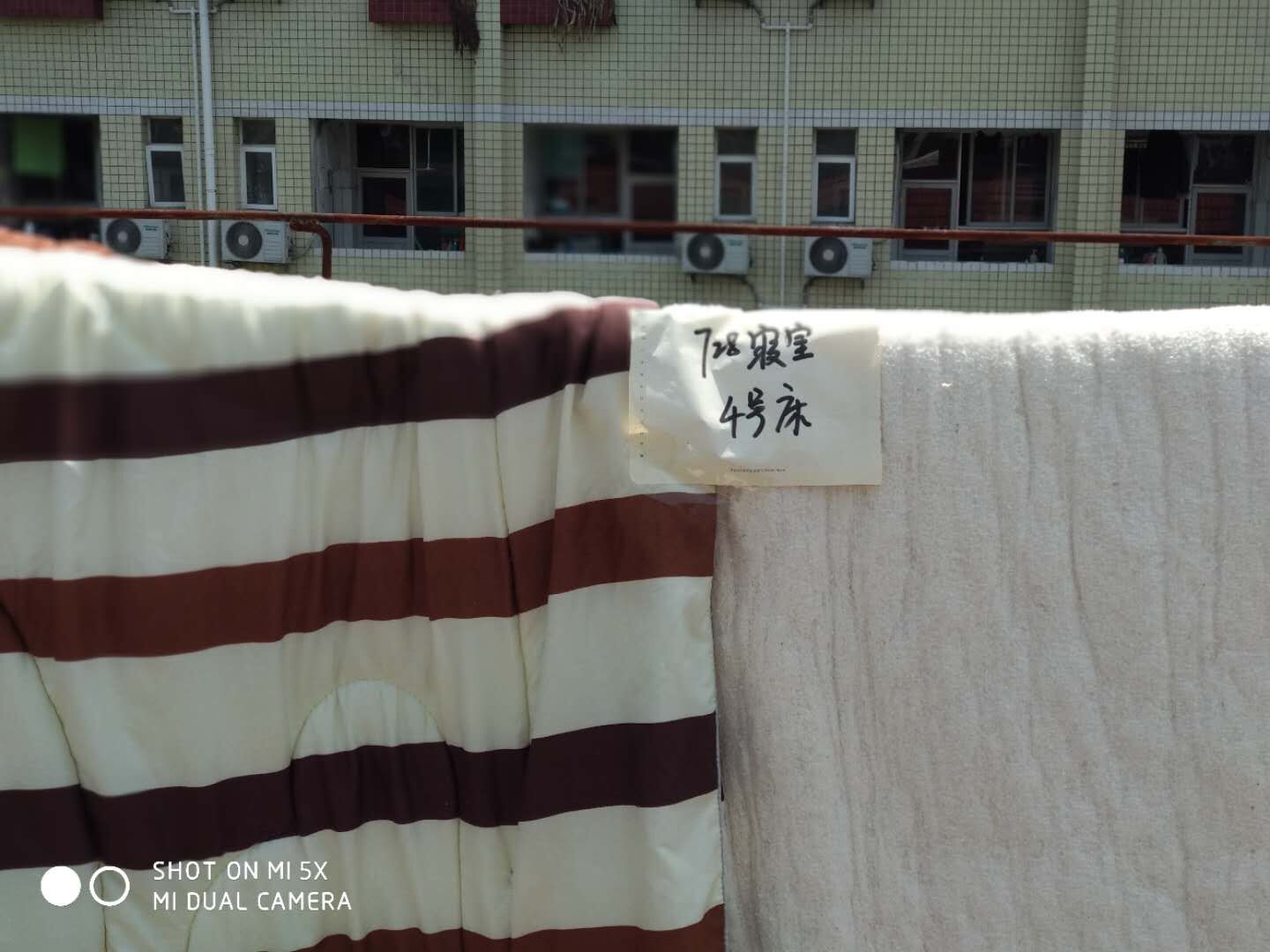 橘园二舍宿管员马红蕾每天晚上把学生们的诉求一条条记下来,第二天一早巡查完各楼层安全,挨个儿把要晒的被子抱出来,夹上写有寝室号和学生姓名或床号的小纸条,搭在宿舍外面的晾衣架上。“地方有限,每天最多晒个二三十床,”马红蕾说,“反正挨倒来,只要给我说了的,我肯定要办到。”