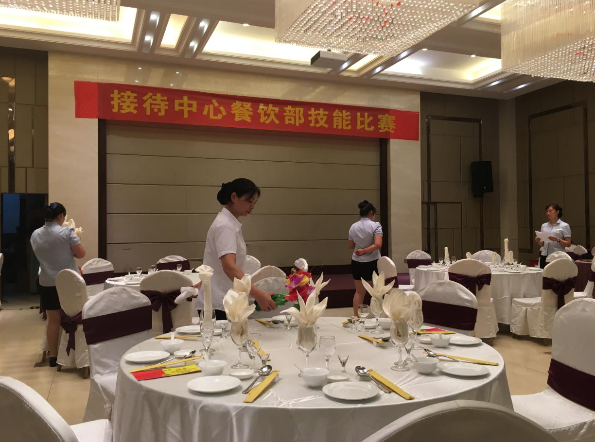 为提高员工的服务技能和业务素质,也给员工一个展示自我的平台,接待中心于开学前举行了中餐宴会摆台技能比赛。中心管理层到场观摩。