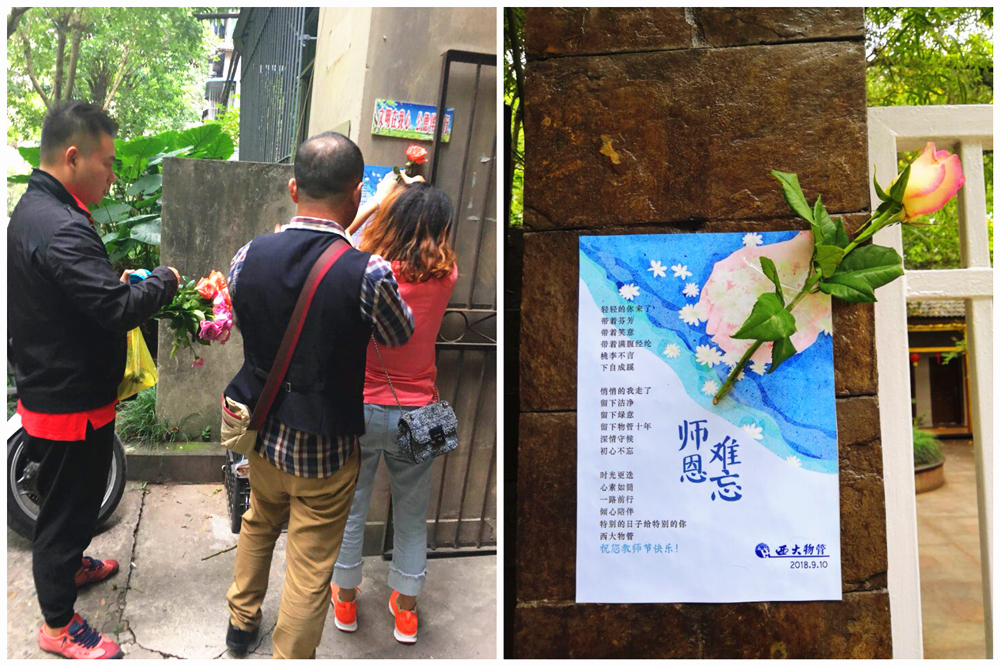 物业服务中心除准备了鲜花、精美的小礼物送给当天上课的老师,还组织勤工助学学生在10栋公共教学楼300余间教室的黑板上书写祝福语,在中心图书馆、蚕学宫等18个楼栋大门旁张贴祝福海报,在斑竹村、红石村、黄树村、四新村、文化村等5个家属区的144个单元楼门口张贴祝福海报和鲜花。很多师生和离退休教职工都驻足细读海报内容,赞叹“很用心”。
