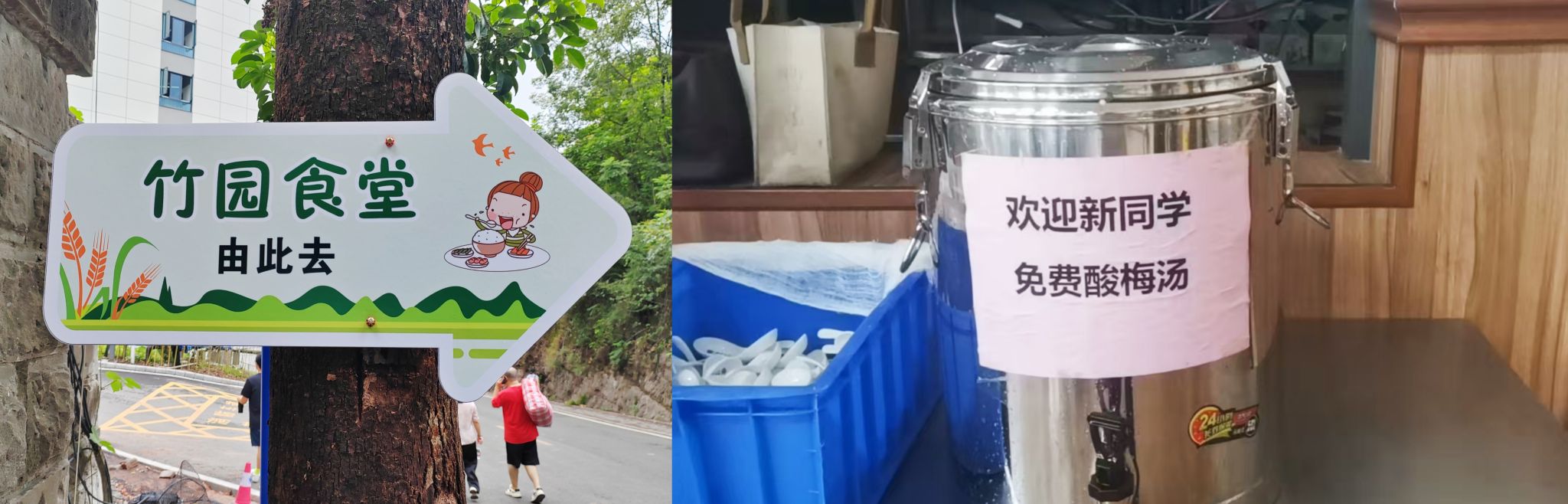 为让新生“吃得安心”,膳食服务中心提前谋划、精心部署,从菜单定制到食材采购,从窗口设置到人员培训,每个环节都反复推敲。在各园区增设清晰的就餐指引路标,帮助新生快速熟悉校园环境,解决“找餐难”问题;各食堂张贴温馨提示,延长供餐时间,确保晚到的新生和家长也能吃上热乎饭菜;免费提供茶水、酸梅汤、冰镇西瓜等消暑果饮。