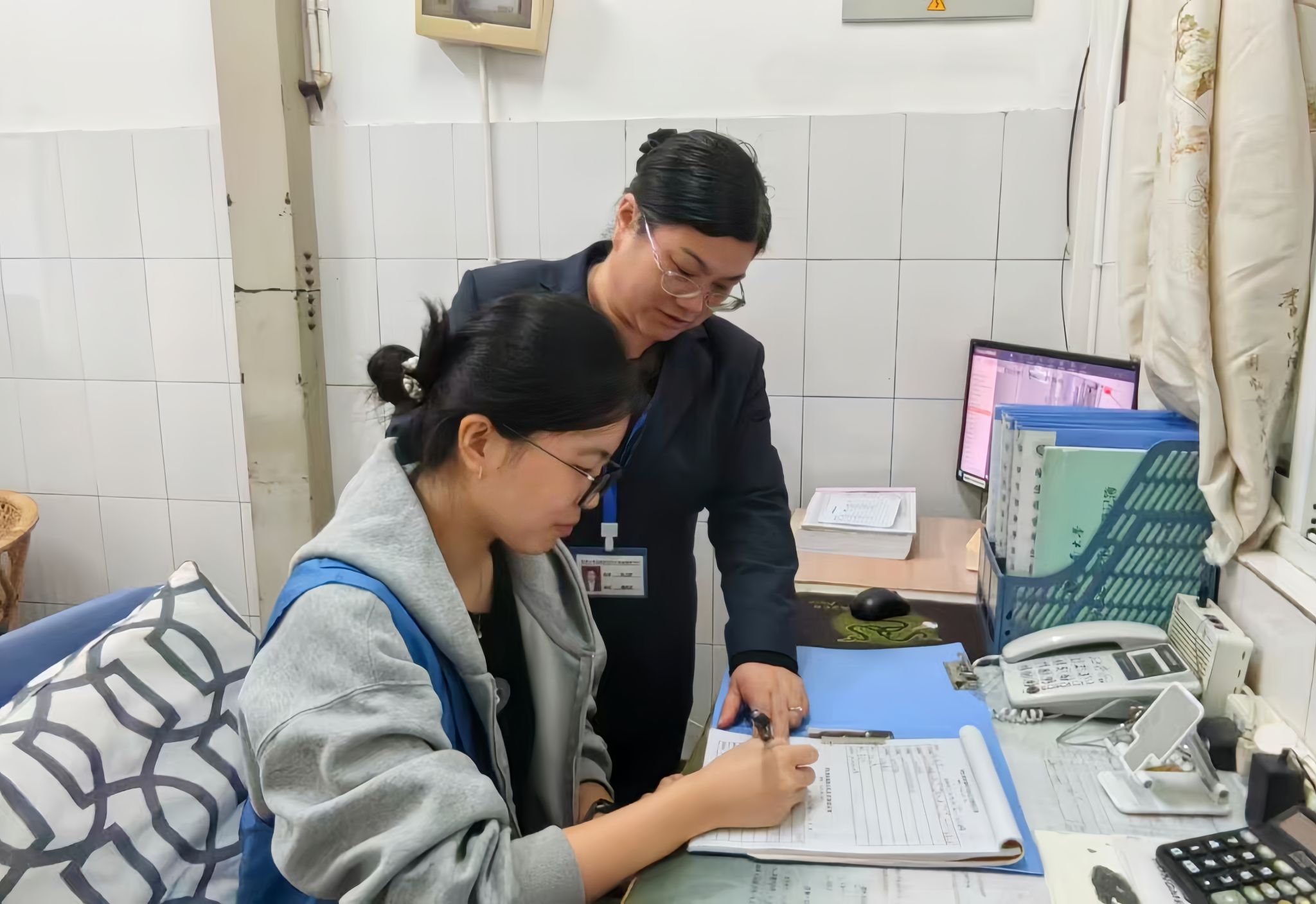 活动中,像邓瑛这样的资深宿管员担任“职业导师”,带领学生深入门岗值守、安全巡查、设施点检等日常工作一线。从接待来访人员到排查消防隐患,从登记报修到巡查楼道,学生们在亲身参与中,真切体会到宿舍平稳运行背后所需要的细致和坚持。