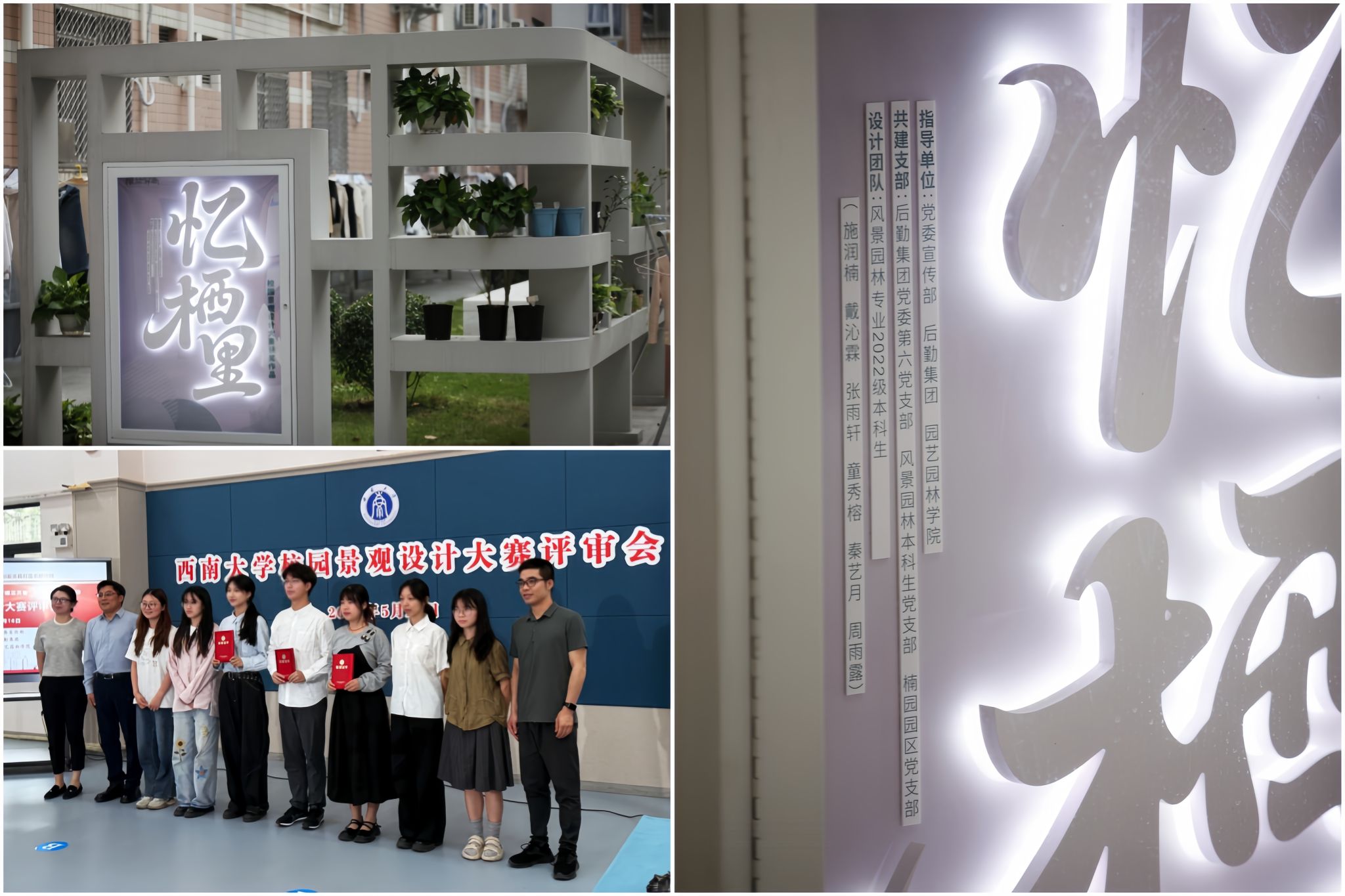 大赛的获奖作品——园艺园林学院2022级本科生施润楠团队设计的“忆栖里”方案,历经半年多的精细施工,终于在2025年年末,将蓝图完整地铺展在楠园一舍的中庭。如今步入其中,一个功能清晰而又充满诗意的微缩生态跃然眼前:入口景观墙上,“忆栖里”三字鲜明点题,瞬间聚焦视线;四周巧妙分区,文化展示、绿植观赏、休憩交流、日常晾晒等空间有序分布,各类绿植、盆栽高低错落,交织出丰富的层次和盎然生机。这里不仅是一处经过美化的空间,更是一个承载多重叙事的鲜活地标——它记录着学生创意从构想到落地的轨迹,凝结着后勤集团第六党支部、风景园林本科生党支部和楠园园区党支部三方共建的协作情谊,也静静诠释着对校园生活的美好期许。
